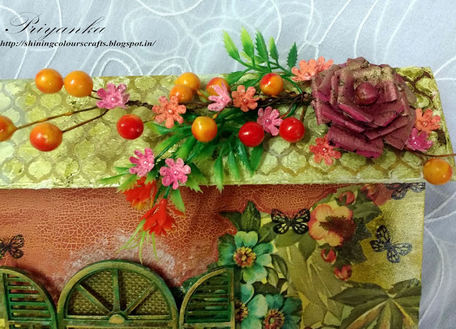 Roof is made with thick cardboard, created the texture using stencil and texture paste and then followed by a spray of Citron Breeze colour. Some bushes and florals on the top of roof added more life to my project.